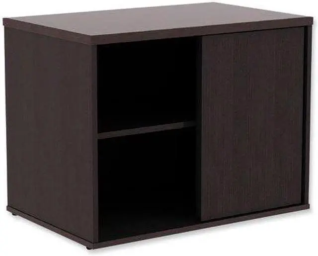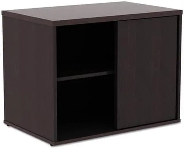 Sturdy, low-profile cabinet for storage or as a low credenza with your desk. Can be used as a return to expand your desk space to create "L" or "U" shaped desk configurations. Coordinating laminates for use with Alera Valencia, Sedina, or Open Office Desk Series. Sliding doors are removable for open storage. Durable woodgrain laminate is scratch, dent, and water-resistant. Add a coordinated cushion top to expand your seating space with Alera Credenza Cushions. Leveling glides compensate for uneven floors. Color(s): Espresso; Overall Width: 29.5"; Overall Depth: 19.13"; Overall Height: 22.78".