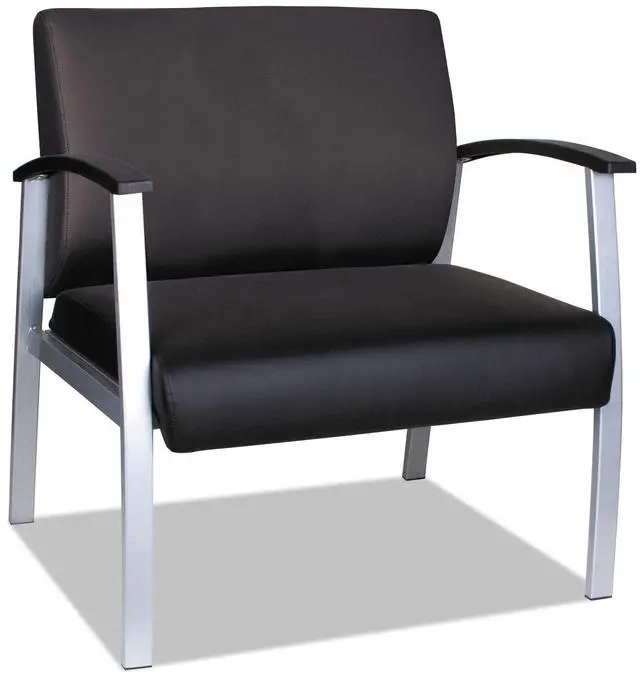 Alera metaLounge Series Bariatric Guest Chair, 30.51" x 26.96" x 33.46", Black Seat, Black Back, Silver Base - Stylish and flexible design is ideal for office reception areas to waiting areas and more. Thickly padded seat cushion relieves pressure points at the back of the knees. Visible clean-out area between the back and seat prevents dirt and debris build-up. Strong metal frame withstands heavy use and added durability and strength. Wall-saver leg design helps protect against wall damage. Polyurethane arms are both comfortable and long-lasting. Antimicrobial agent added to prevent the growth of germs on the upholstery surface.