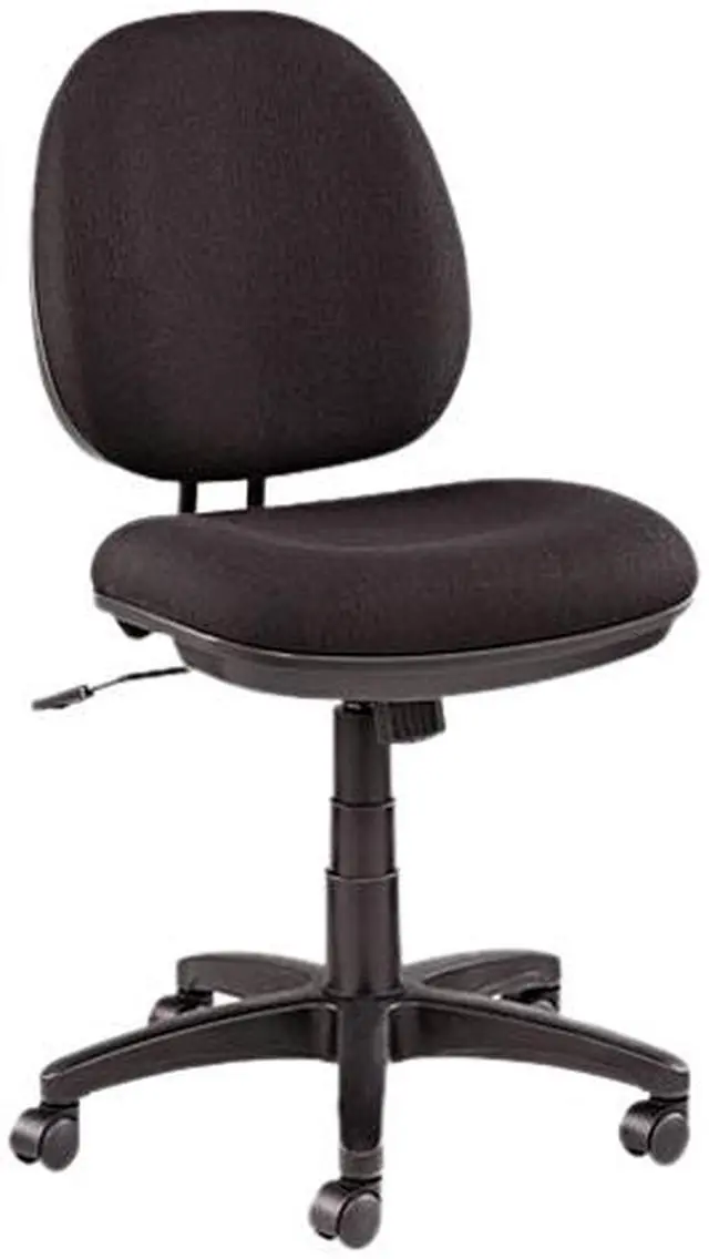 Molded plastic shell resists impact. Waterfall seat edge helps relieve pressure points on the underside of legs. Five-star base with casters for easy mobility. Optional Arms sold separately. Recommended Applications: General Office & Task; Seat/Back Color: Black; Arms Included: No; Pneumatic Seat Height Adjustment: Yes.