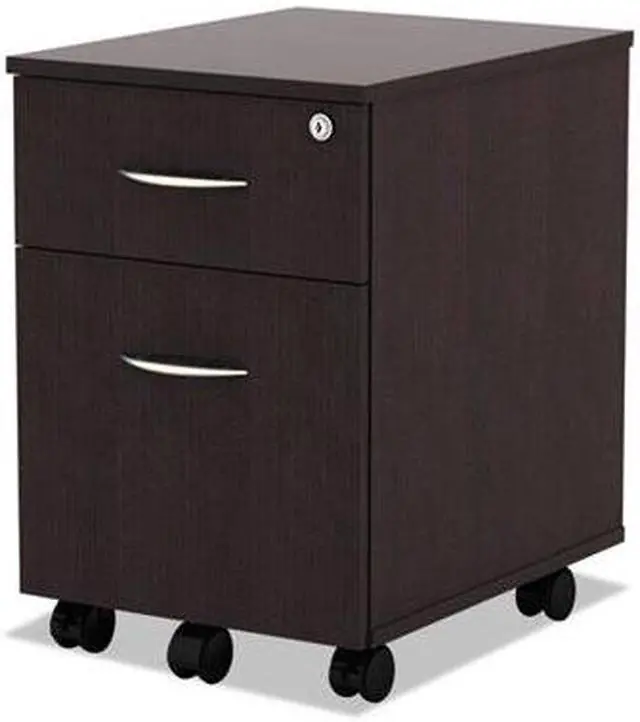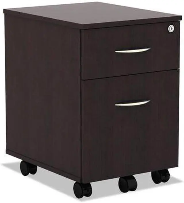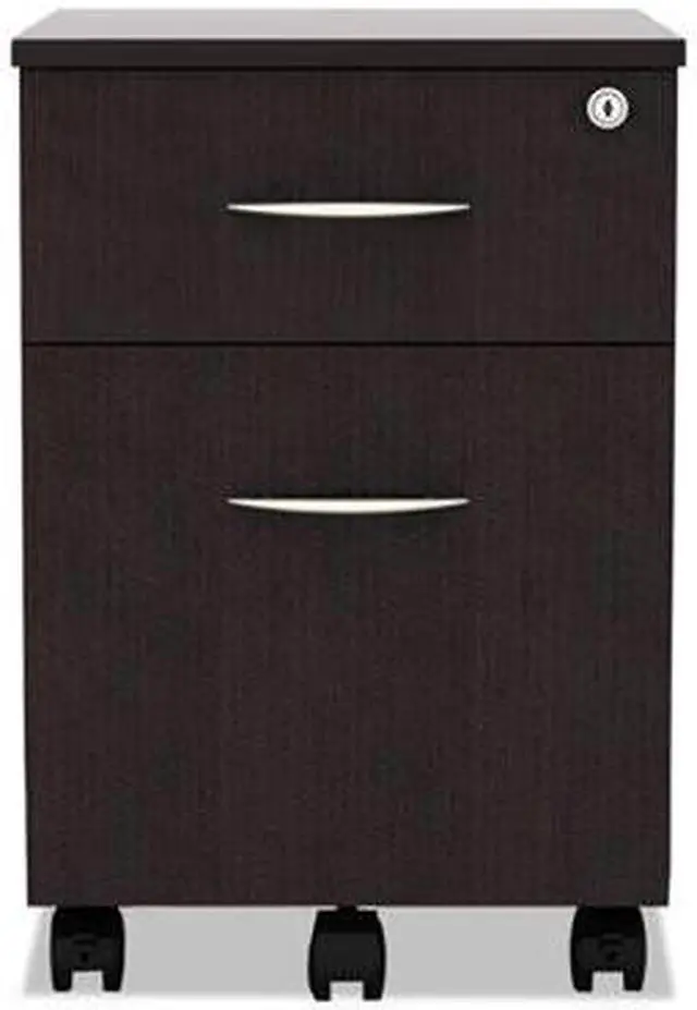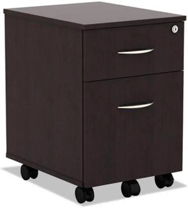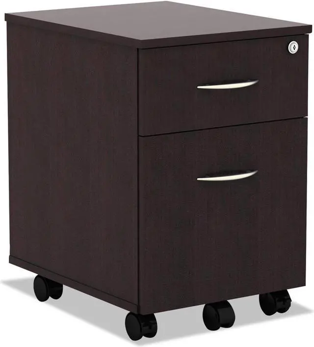 Sturdy woodgrain laminate mobile box file pedestal to store all your office necessities. Full-extension ball bearing slides on file drawer for easy access. Durable laminate is water-, scratch-, and dent-resistant with 3 mm protective edge banding. Two fold-away safety keys included. Accepts Alera Pedestal Cushions for an instant seating option. Number of Drawers: 2; Drawer Configuration: Box/File; Anti-Tip Mechanism Indicator: Yes; Anti-Tip Mechanism: Fifth Wheel.