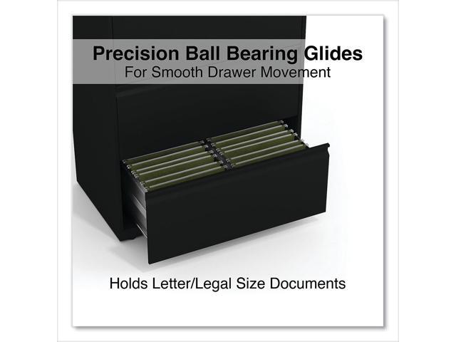 - Lateral file cabinet has four drawers with side-to-side hanging rails to hold letter- and legal-size files. Central lock secures drawers on both sides for extra storage safety.