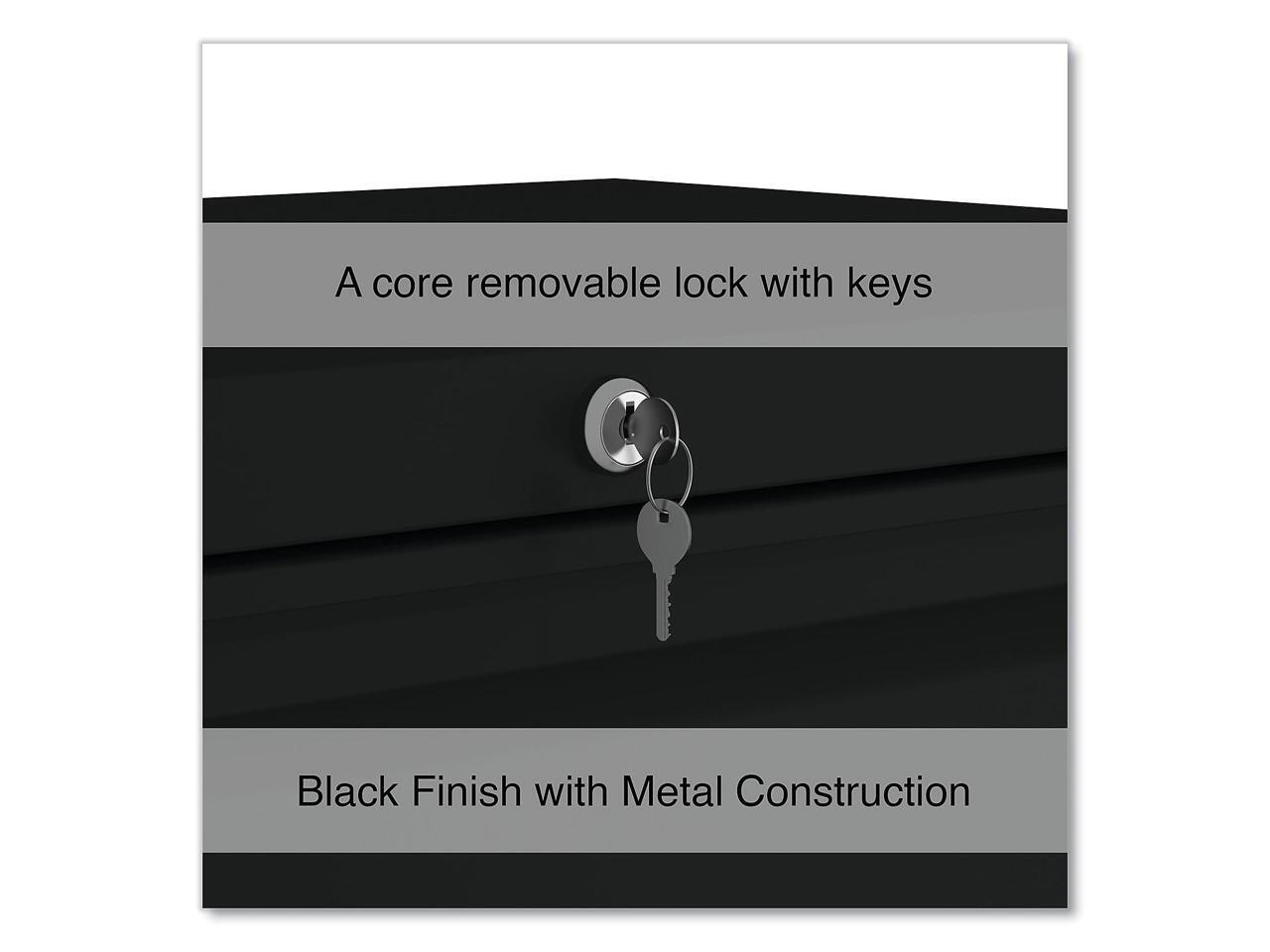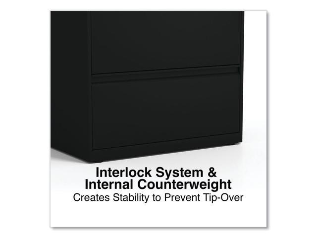 - Black color, powder-coated finish, and steel construction for durability. Cabinet has interlocking system that allows only one open drawer at a time to prevent tipping, has four adjustable leveling glides, has double-wall reinforced drawer fronts and counterweight that provides extra stability.