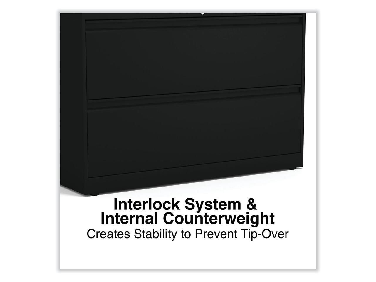 - Anti-tipping interlock system allows only one drawer to open at a time. Alera two-drawer lateral file cabinet holds letter or legal documents in side-to-side hanging rails. Double-wall reinforced drawer fronts add extra security and stability.