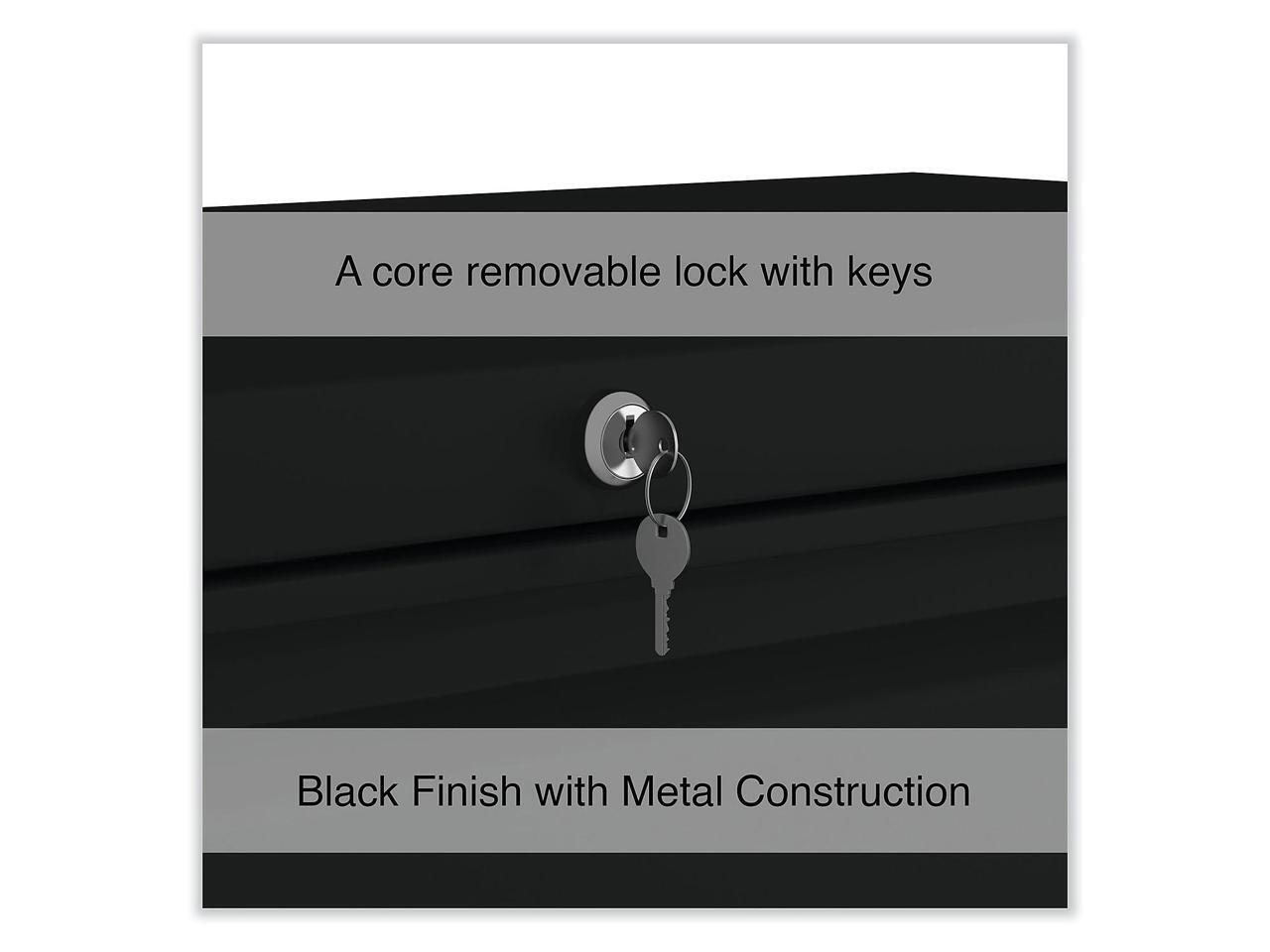 - Single key core removable lock with two keys. Steel construction with black finish for a sleek, professional look. No assembly required.