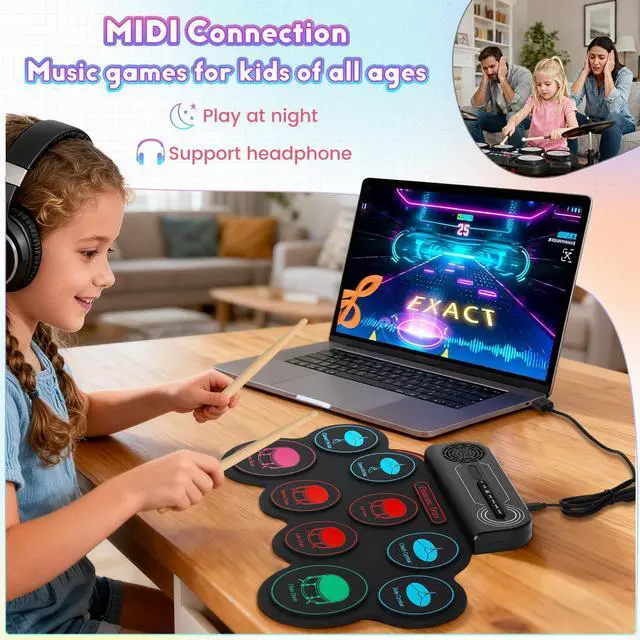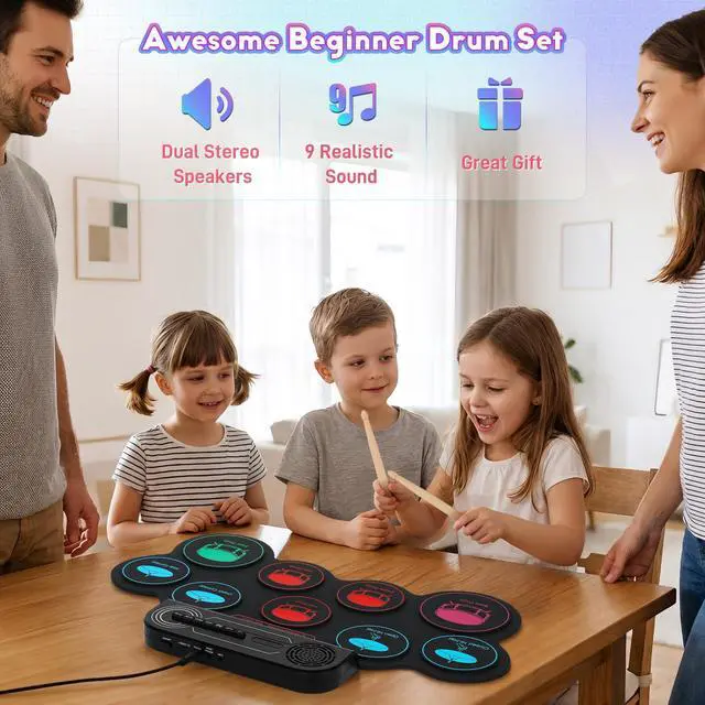 Electronic Drum Set, 9-Pad Kids Electric Drum Set Dual Stereo Speaker, MIDI. Portable Roll Up Drums Practice Pad for Kids, Perfect Birthday&Christmas Gift for Boys&Girls