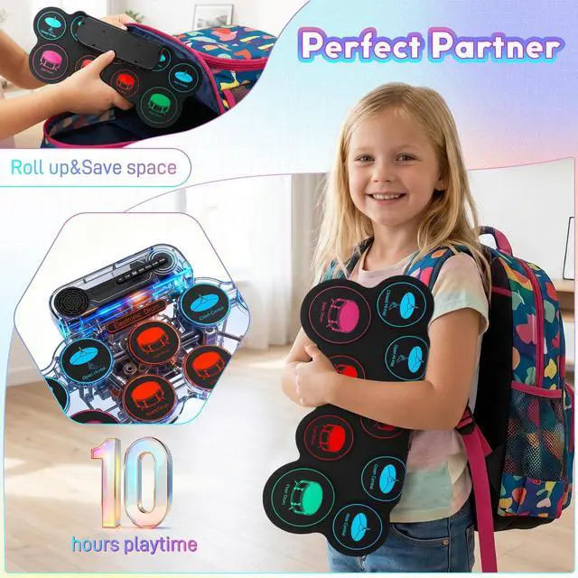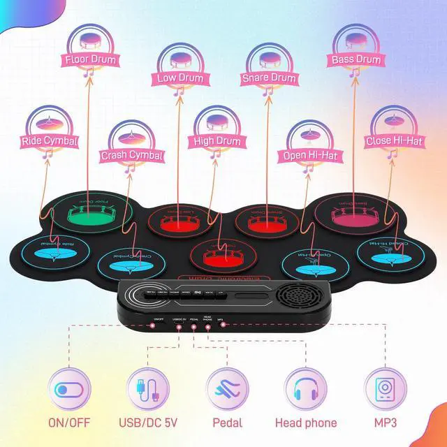 Rechargeable Drum PadsThis children's electronic drum pad set features a built-in 2000mAh lithium battery,powered by a 5V 2A adapter (adapter sold separately).A full charge delivers up to 10 hours of playing time.Whether for extended practice sessions or outdoor performances,it handles it all with easemaking it the perfect companion for music lessons,vacations,parties,Christmas etc.
