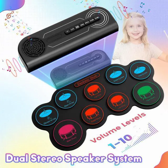 Dual Stereo SpeakersThis 9-tone electronic drum set features high-quality dual stereo speakers with 10 volume levels,making it the perfect drum kit for indoor and outdoor parties and performances.You can also connect headphones to enter night/silent practice mode,avoiding disturbances to family or neighbors while enjoying a quiet creative space!