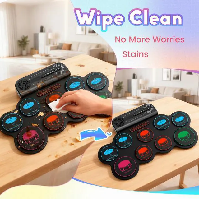On-The-Go DrummingThis silicone electronic drum set is easy to operate,exquisitely designed,and portable.Roll it up and slip it into your backpack to take it anywhereoutdoor parties,choir rehearsals,recording studios or music/drum lessons.Play to your heart's content!
