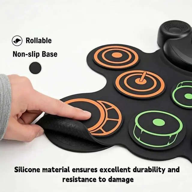 Complete 9-Pad Electronic Drum Kit for kids. This roll-up drum set features 3 tom drums, 2 cymbals, 1 hi-hat, 1 ride cymbal, 1 snare, 1 bass drum, and 2 foot pedals. It includes 7 unique drum tones, 10 demo songs, and 10 rhythm patterns, providing everything kids need to start learning and playing drums instantly