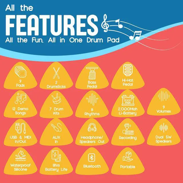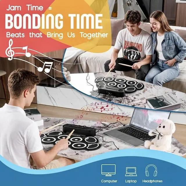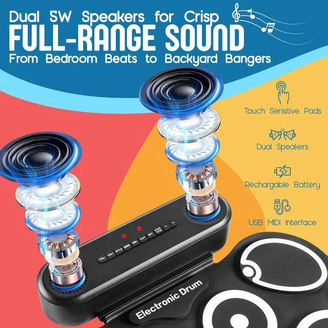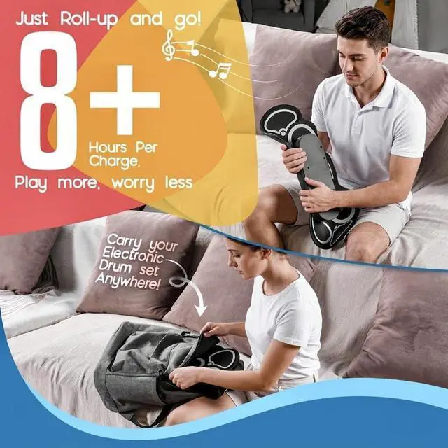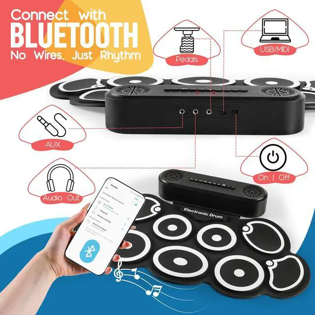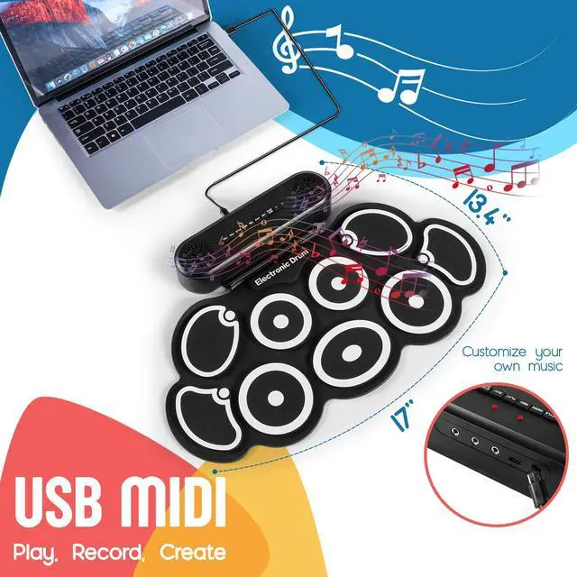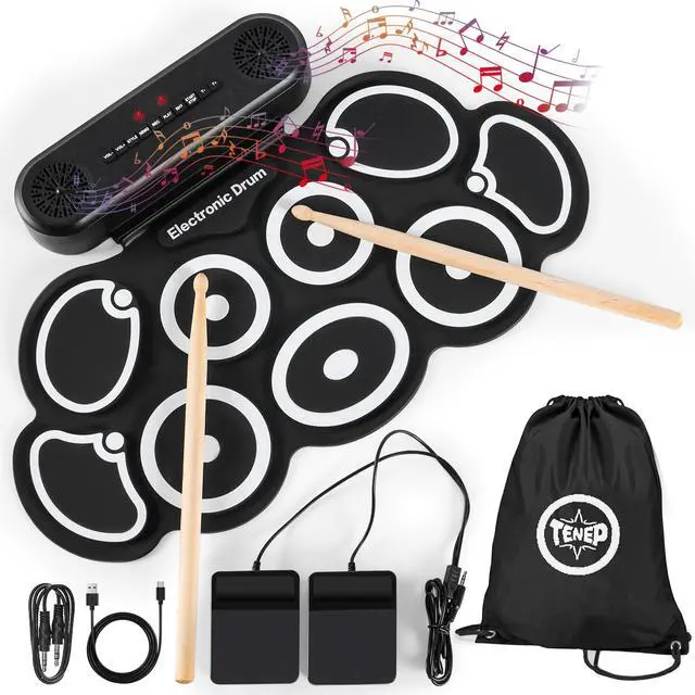 Experience flexible, on-demand drumming with the TENEP 9-pad electronic drum set. Designed for portability and performance, this roll-up drum kit provides a practical solution for practicing, recording, and casual playing without the need for a full drum setup. The layout includes all essential drum elements, allowing users to develop timing, coordination, and rhythm skills. The responsive silicone surface delivers a comfortable playing experience while maintaining durability for regular use. With built-in dual speakers, adjustable volume levels, and headphone compatibility, the drum pad adapts easily to different environments. Bluetooth and USB MIDI connectivity expand functionality, enabling integration with music software, mobile devices, and external sound libraries. The lightweight, foldable design combined with a rechargeable battery makes it suitable for home use, travel, or studio sessions.
