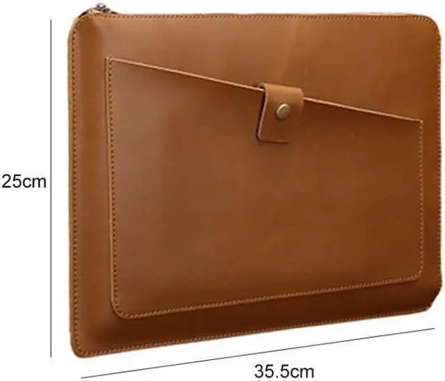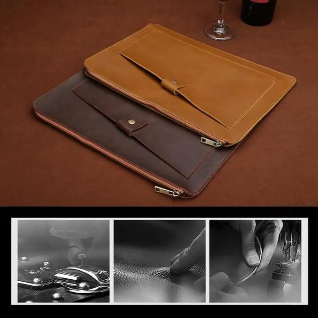 1. Genuine leather material, simple and comfortable. 2. Good craftsmanship and soft lining, protecting your laptop from shock, bump, scratch, splash and dust. 3. Compatible with 13.3 inch and below laptop. 4. Note: Not include the phone, glasses, bottle and other objects.