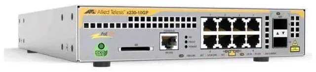 L3 managed switch, 8 x 10/100/1000Mbps POE+ ports, 2 x SFP uplink slots, 1 Fixed AC power supply US Power cord. Rack mount kit (AT-RKMT-J14) is included in the unit. TAA compliant version