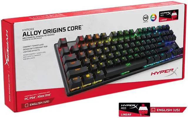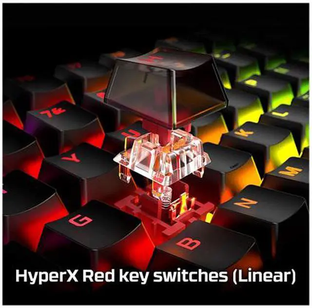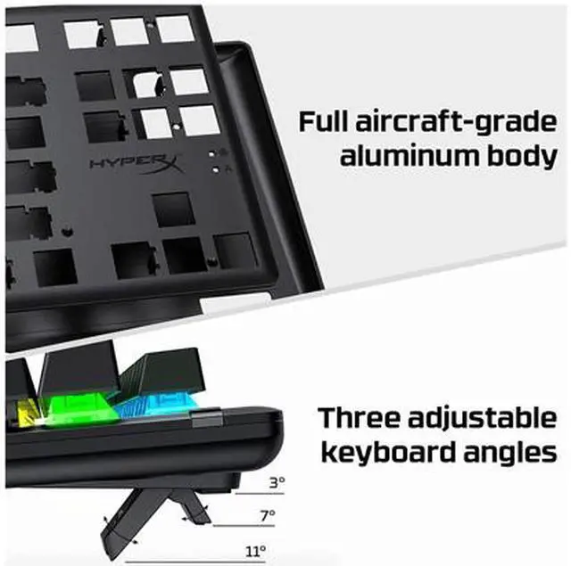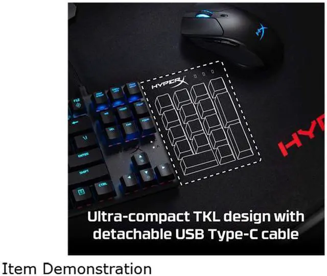Features| Features | HyperX mechanical switches Full aircraft-grade aluminum body Ultra-compact TKL design with detachable USB Type-C cable Dazzling RGB lighting with dynamic effects Advanced customization with HyperX NGENUITY software Three adjustable keyboard angles Onboard memory for three profiles Game Mode, 100% anti-ghosting, and N-key rollover functionalities |