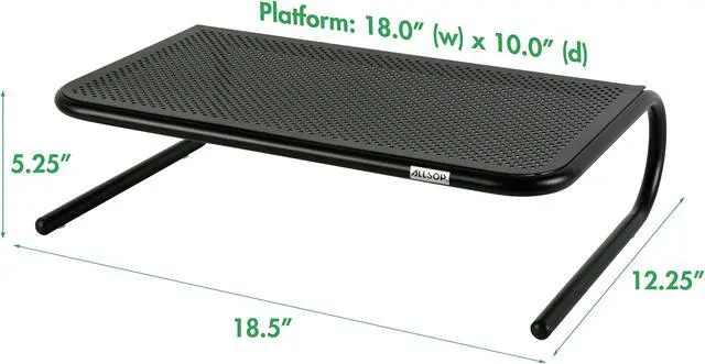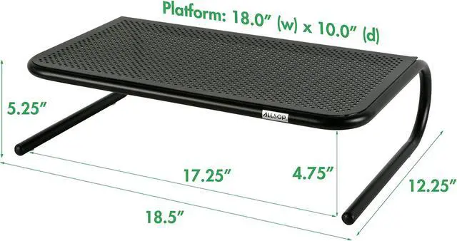 Raises monitor to a comfortable height, making typing and viewing easier on your back and neck. Wide surface supports up to 21" monitor or an ergonomic keyboard. Saves desk space by storing keyboard or laptop beneath. Supports up to 30 lbs. Stand Type: Monitor; Width: 19"; Depth: 12 1/2"; Maximum Height: 5 1/4".