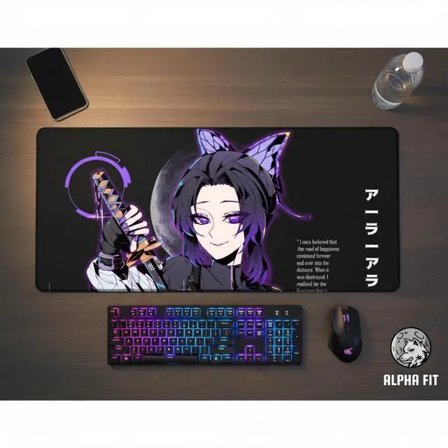 Bring a touch of deadly elegance to your desktop with this stunning anime mouse pad. Featuring a mysterious swordswoman adorned with a purple butterfly motif, this design captures the perfect balance between beauty and danger. The dark background, accented by a glowing crescent moon and vibrant violet hues, makes this gaming mouse pad an ideal match for dark-mode or purple RGB setups. With the iconic "Ara Ara" typography and a poetic quote about happiness, this mat is a must-have for fans of the "Insect Breathing" aesthetic and sophisticated anime lore.