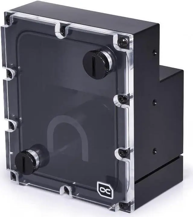 The Alphacool ES 4U Reservoir with D5 top is a development for the Enterprise Solutions series. It has an integrated pump top for powerful D5 pumps. The combination of pump top and reservoir was designed to be mounted directly in the front of 4U servers. The positioning of the reservoir in the enclosure and the acrylic cover used make maintenance and control of the water circuit much easier. Connection optionsThe ES 4U Reservoir has a total of 3 inlets and one outlet. All connections use a G1/4" thread. 2 inputs are located on the acrylic cover in the front range.