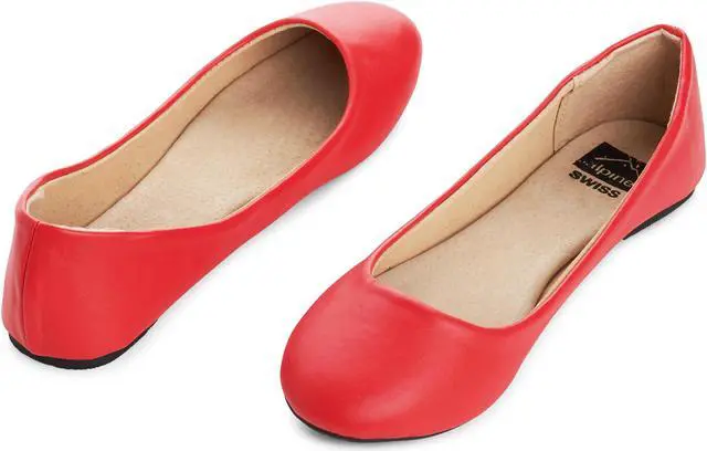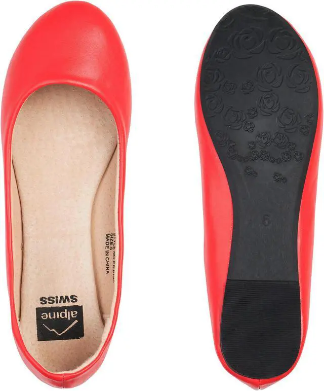 Product Features: Luxurious Genuine Suede Leather InteriorSuper ComfortableFaux Leather UpperRubber Treaded OutsolesRounded ToeTagless Footbed for comfortThey run true to size. We offer a wide range of comfortable Flats. Be sure to check our complete selection, Chances are you will also love one of our other styles as well. Alpine Swiss donates 250 meals every day to hungry children in the U. S. and around the world through our partnership with Childrenâs Hunger Fund. These meals are hand delivered in a Food Pack, which will contain enough food to feed a family of 4-5 for a week to the homes of the needy by trained volunteers in their community, establishing relationships that foster genuine care. Your purchase fuels this effort! Thank you!