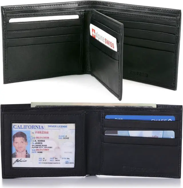 Measures: 4 3/4" x 3 5/8" x 1" Bifold Wallet with a trifold flip out with ID and Card Slots Alpine Swiss Cross Mark outside12 Card Slots, 3 additional oversized card slot pockets Made of Semi Glossy finish Luxurious Lambskin Leather Inside & Out for BlackMade of Distressed Finished Crunch Leather a full grain Aged Leather in Brown and GrayDouble Bill Section has two pockets to separate large and small billsComes in Alpine Swiss Cotton Gift Bag Alpine Swiss donates 250 meals every day to hungry children in the U. S. and around the world through our partnership with Childrenâs Hunger Fund. These meals are hand delivered in a Food Pack, which will contain enough food to feed a family of 4-5 for a week to the homes of the needy by trained volunteers in their community, establishing relationships that foster genuine care. Your purchase fuels this effort! Thank you!
