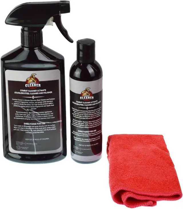 Includes a 14 x 14 inch microfiber cloth to use with the 16 ounce Combat Cleaner stylish pump bottle