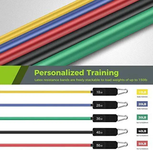 Different level resistanceyellow (10 lbs.), blue (20 lbs.), green (30 lbs.), black (40 lbs.), red(50 lbs.), all exercise bands are 48" in length, and can be used alone stacked in any combination to a maximum equivalent of 150 lbs.