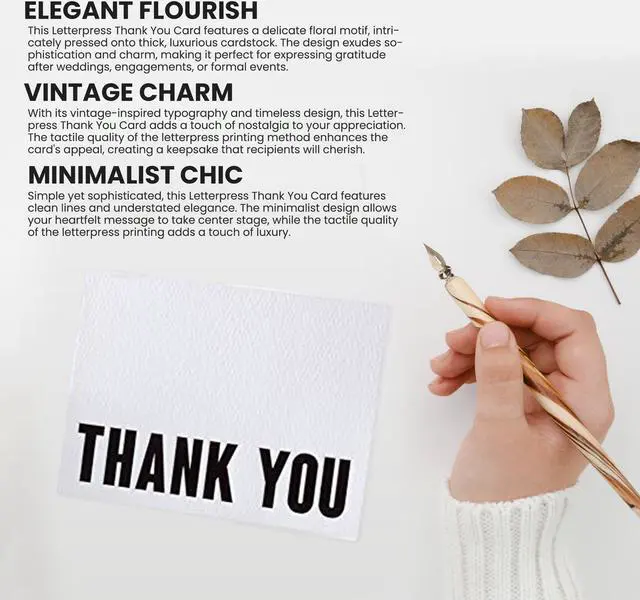 Elegant letterpress thank you on the front with no ugly logos on the back. Perfect for weddings and all other elegant occasions.