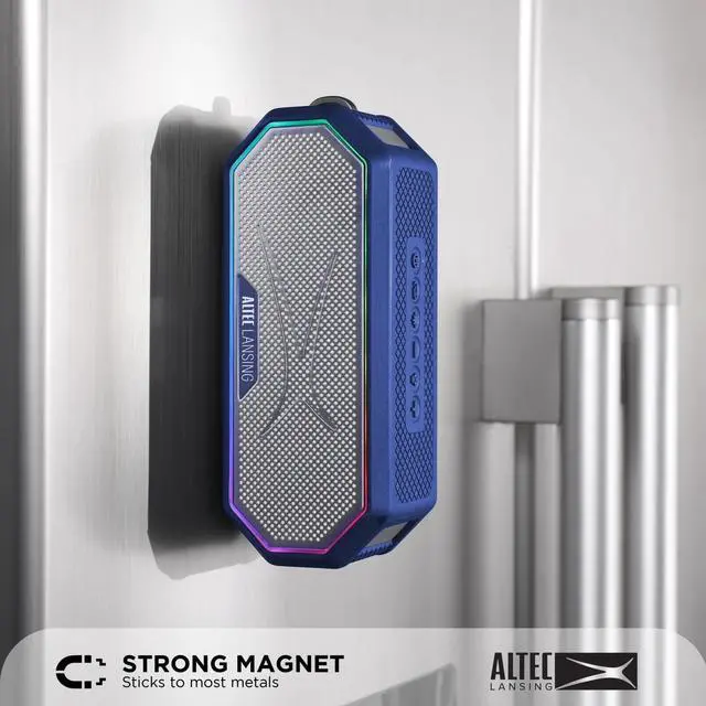The Altec Lansing Hydra Jolt 2.0 Everything Proof Wireless Magnetic Portable Bluetooth Speaker (Periwinkle Blue/White) is a rugged and versatile audio companion designed for music lovers who need durability without sacrificing portability. Built with Altec Lansings signature Everything Proof construction, this compact speaker is engineered to resist water, dust, sand, and even floating accidents, making it an excellent choice for outdoor adventures, poolside relaxation, beach trips, and everyday use.Despite its small footprint, the Hydra Jolt 2.0 delivers surprisingly powerful and clear sound performance for its size. The speaker is tuned to provide balanced audio with punchy bass and crisp highs, ensuring enjoyable playback whether you're listening to music, podcasts, or streaming videos. Its wireless Bluetooth connectivity allows quick pairing with smartphones, tablets, and other compatible devices, giving users seamless freedom from cables. One of the standout features of the Hydra Jolt 2.0 is its builtin magnetic mounting system. This clever design lets you easily attach the speaker to metal surfaces such as gym equipment, toolboxes, refrigerators, or outdoor fixtures, adding extra convenience and flexibility in placement. The compact and lightweight body makes it easy to carry in a bag or even by hand, perfect for users who are constantly on the move. Styled in an attractive Periwinkle Blue and White color combination, the speaker offers a fresh, modern look that stands out from typical rugged audio gear. Its durable exterior is built to handle bumps and drops during travel or outdoor use, while the rechargeable battery supports hours of continuous playback for extended listening sessions. Overall, the Altec Lansing Hydra Jolt 2.0 is a practical and durable portable Bluetooth speaker that combines tough Everything Proof protection, magnetic mounting convenience, and reliable wireless audio performance in a compact, travelfriendly design ideal for active lifestyles. Unleash your soundtrack on any adventure with the