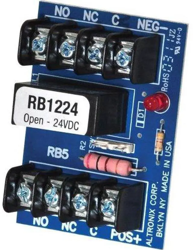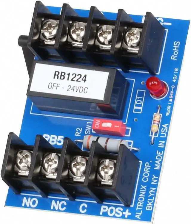 The Altronix RB1224 is a 12 to 24VDC relay module designed for dry contact, line seizure, polarity reversal, latching dry contact, and more. LEDs indicate relay status. The module mounts easily onto a snap track. Also known as -Altronix RB1224 Relay