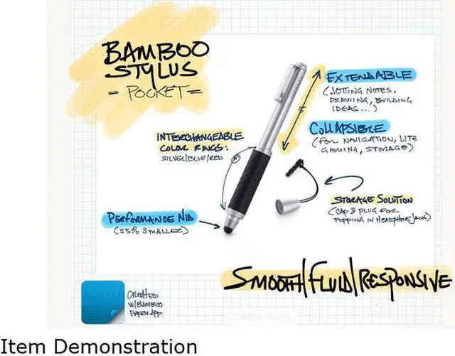 An ideal choice for commuters, travelers, and other mobile users, the Bamboo Stylus Pocket helps you unleash the creative potential of your tablet or smartphone while you're on the go. This convenient touchscreen-optimized stylus features a collapsible, pocket-sized design that extends into a full-sized writing instrument. It also features a balanced design suited for sketching, drawing, note-taking, highlighting, and other forms of creative expression. Pocket-Sized, Expandable Stylus The Bamboo Stylus Pocket features a compact design that easily slips into a pocket or handbag. Thanks to the Pocket's convenient, collapsible barrel, you can easily expand it into a full-sized writing instrument when you're ready to write. The stylus even comes with a cap with a 3.5-millimeter adapter, so you can plug it into your device's headphone jack to keep your stylus and tablet together for storage. And with the included interchangeable color rings, you can personalize your stylus and mark it as your own. Elegant Design with a Smooth, Natural Feel The Bamboo Stylus Pocket combines comfort and elegance with its sophisticated design, satin-textured metal body, and balanced weighting. With its natural and comfortable grip, it delivers responsiveness and performance that rivals that of a high-end pen. Expand the Versatility of Your Tablet The Bamboo Stylus Pocket makes your tablet even more versatile by making it possible to take handwritten notes, highlight text, edit documents, and sketch out ideas. With the stylus, you can turn your tablet into an artist's canvas one moment and a notepad the next. Use it with creative apps to make your own art, capture your ideas, or edit photos.