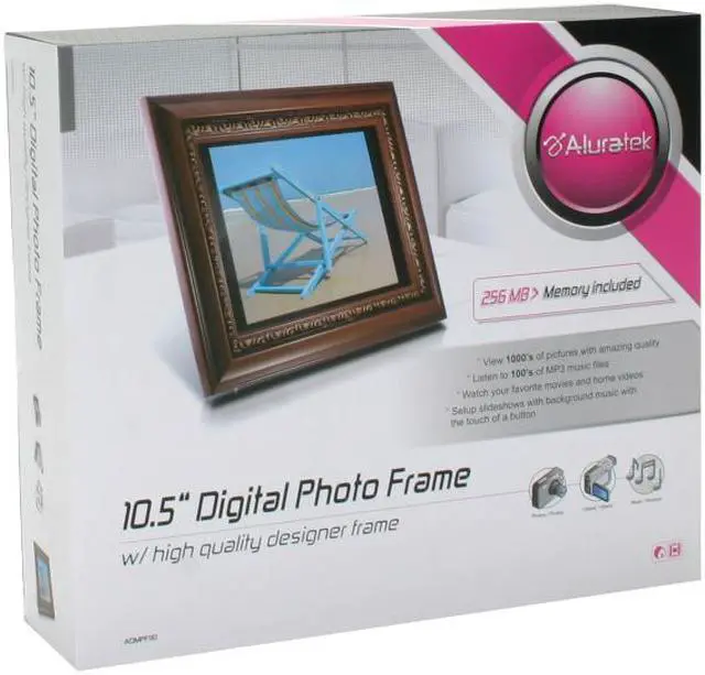 More than just a digital photo frame, Aluratek raises the bar with its Digital Lifestyle Device (DLD). View hi resolution print quality pictures easily by inserting your camera or camcorders digital media card or USB thumb drive directly onto Aluratek's DLD. With the built-in 256MB flash media you can also transfer your favorite digital files directly from your computer fast and easy without any software. Play slideshows, zoom, rotate, and listen to hi quality background music all at the touch of a button with the included remote control. Switch to movie mode and enjoy amazing video and audio near HD quality. Browse and listen to all of your favorite MP3 music files after your movies over. With Aluratek's DLD it is now time to have fun with your digital pictures, movies, and MP3 music files that are just sitting on your computer or in your digital camera. Whether it is at work or at home let the fun begin!