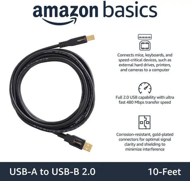 IN THE BOX: (1) 10-foot high-speed multi-shielded USB 2.0 A-Male to B-Male cable