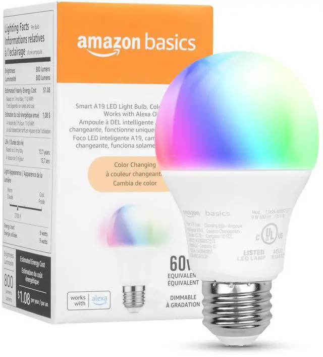 Amazon Basics Smart A19 LED Light Bulb, Color Changing, 9W (60W Equivalent), 800LM, Works with Alexa Only, WiFi 2.4 GHz, No Hub Required, Mood Lighting, Energy Efficient, 1-Pack