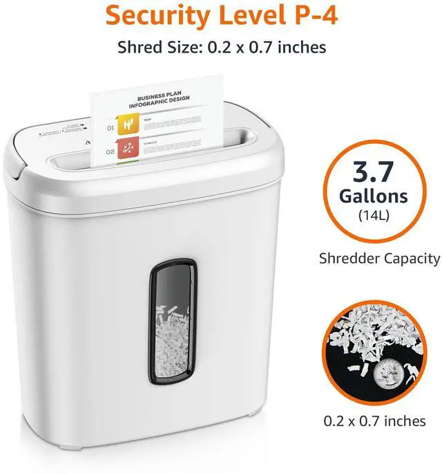Cross-cut paper and credit card shredder cuts material into approximate 0.2 x 0.7 inches (5 x 18 mm) pieces; meets security level P-4 standards
