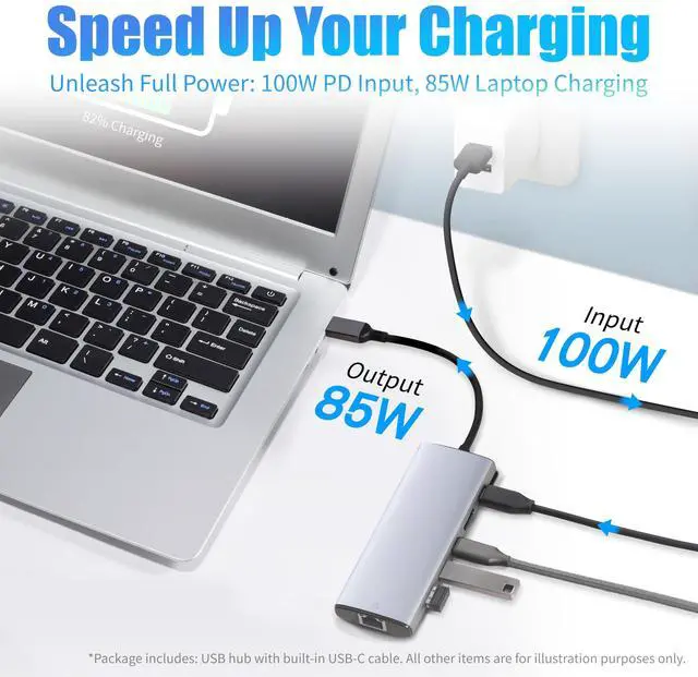 The PD input supports up to 100W. Use a proper 100W-rated USB-C adapter to ensure enough power for charging your laptop.