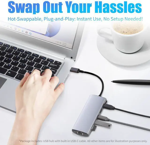 The hub may not initialize on some systems. Reconnect and ensure all ports are secure. Supported OS: Windows 10/11, macOS 10.14+, Android 11+, iPadOS 15+.