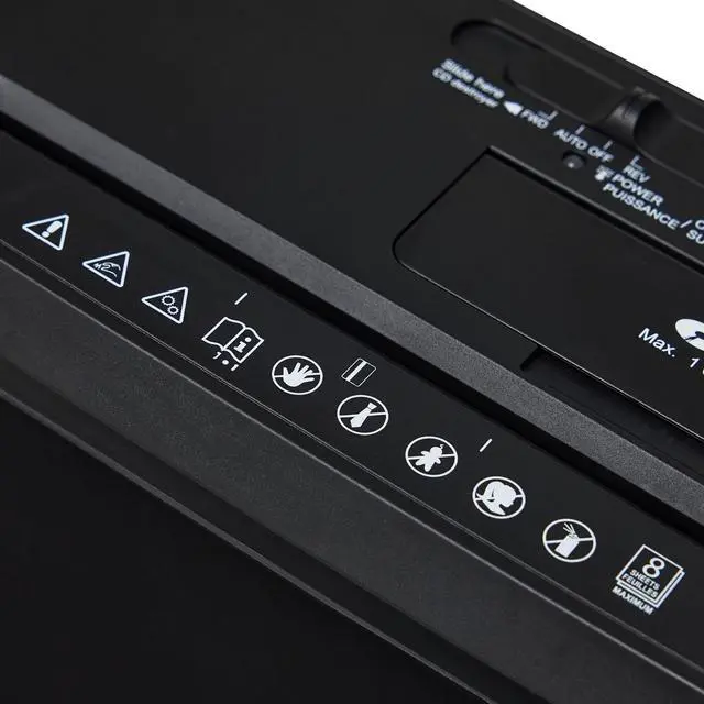 Shreds up to 8 sheets of 20-pound bond paper at a time, including staples and small paper clips; also destroys CDs, DVDs, and credit cards, one at a time (not suitable for metal credit cards)