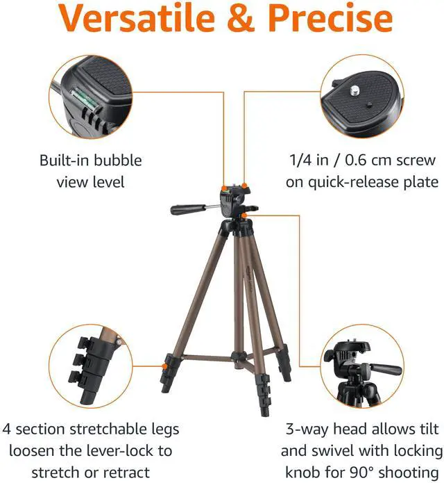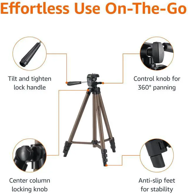 Amazon Basics 50-inch Lightweight Portable Camera Tripod Stand with Quick-Release Plate, Adjustable Height, Aluminum, for Travel Photography, Champagne