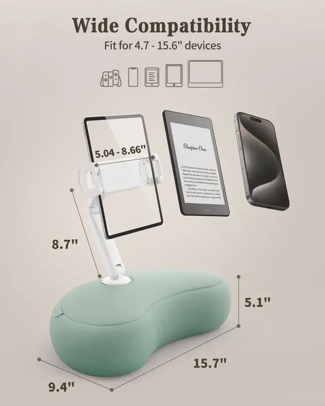 | Specifications | Elastic fabric, food-grade EPS foam particles, and PC+ABS, 14.36 L x 17.91 W x 19 H centimeters, 0.88 kilograms, U5T, Tablet Kindle Holder Pillow, 360 Degree Rotation, Adjustable, Dual-axis arm, Ergonomic, 4.7" - 15.6" Devices, Compatible with Kindle Colorsoft kindle color, kindle paperwhite 2024, kindle scribe, iPad & iPhone, Nintendo Switch, iPad Mini 6, iPad Air 4, iPad Pro 11 / 12.9 inch, iPad Pro 10.5 inch, New iPad Air, iPad Mini, Kindle Fire HD 7 8 10, E-reader, Apple iPhone 17, iPhone Air, iPhone 17 pro, iPhone 17 pro max, iPhone 16 15, iPhone 15 Plus, iPhone 15 pro, iPhone 15 pro max, Apple iPhone 14, iPhone 14 Plus, iPhone 14 pro, iPhone 14 pro max, iPhone 13 Mini, iPhone 13, iPhone 13 Pro, iPhone 13 Pro Max, iPhone 12 Mini, 12, 12 Pro, 12 Pro Max, iPhone 11, 11 Pro, 11 Pro Max, Xs, Xs Max, XR, X, 8, 7, 7 Plus, 6s, 6s Plus, 6, 6 plus, 5s, 5, Galaxy s22 s21 +, s21 ultra, s20, s10+, s10, s9, s8, a71, a52, a51, a32, a22, a12, a10e, a02s, 10e, note 20 ultra, note 10, 9, lg stylo 6, 5, k51, Velvet 5G, v60, c1, lenovo legion 5 5i 7 7i pro duel 2,Motorola one 5g ace, edge, plus, Moto g Play, Xiaomi, Nokia, Microsoft, Lumia, BlackBerry, Surface Pro, Galaxy Tab, Switch, Kindle Holder Tablet Holder, 2 Year |