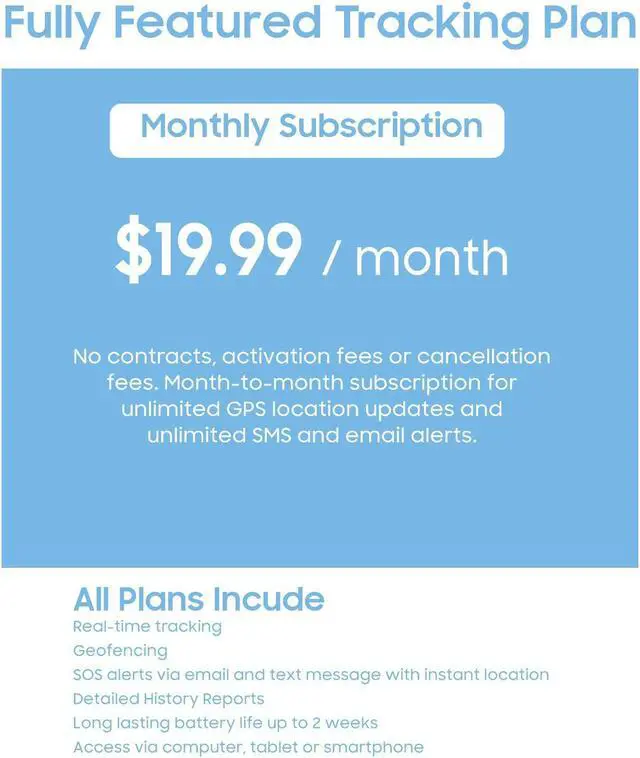 - Monthly subscription for unlimited GPS location updates and unlimited SMS and email alerts