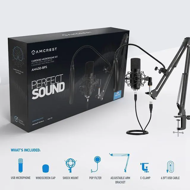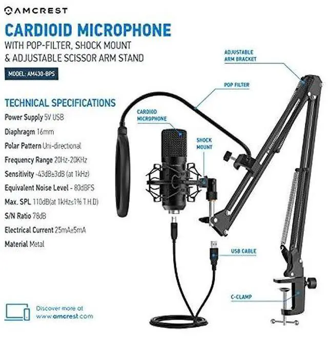 | What's Included | USB Microphone, Windscreen, Shock Mount, Pop-Filter, Adjustable Arm Bracket, C-Clamp, USB Cable, User Manual | USB Microphone, Windscreen, Desk Stand, USB Cable, User Manual | USB Microphone, Shock Mount, Pop-Filter, Desk Stand, USB Cable, User Manual |