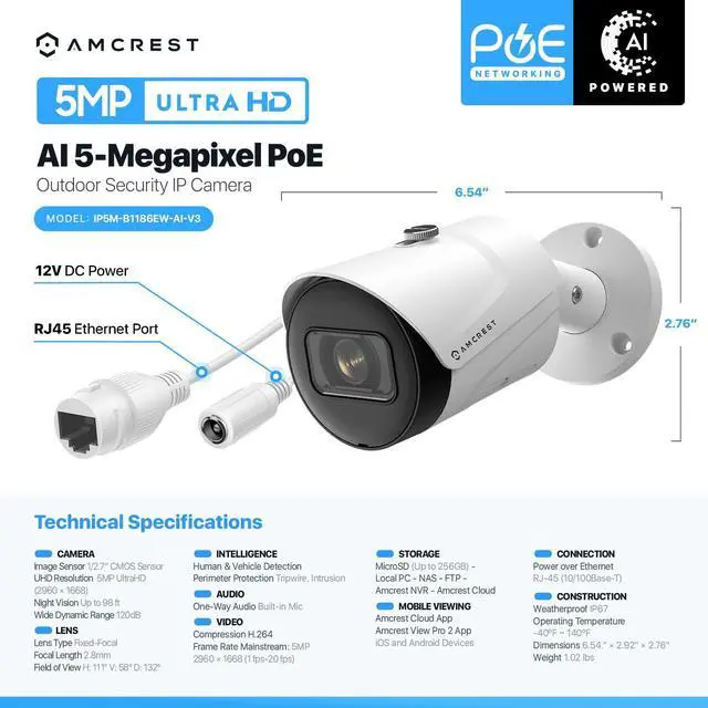 The 5MP UltraHD PoE Indoor/Outdoor Camera is built to endure even the harshest weather conditions and protect against impacts. The camera is equipped with a heavy-duty IP67 weatherproof designed to protect against dust, rain, hurricane level winds.