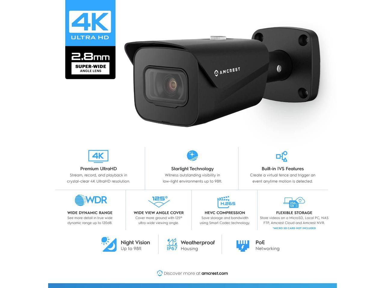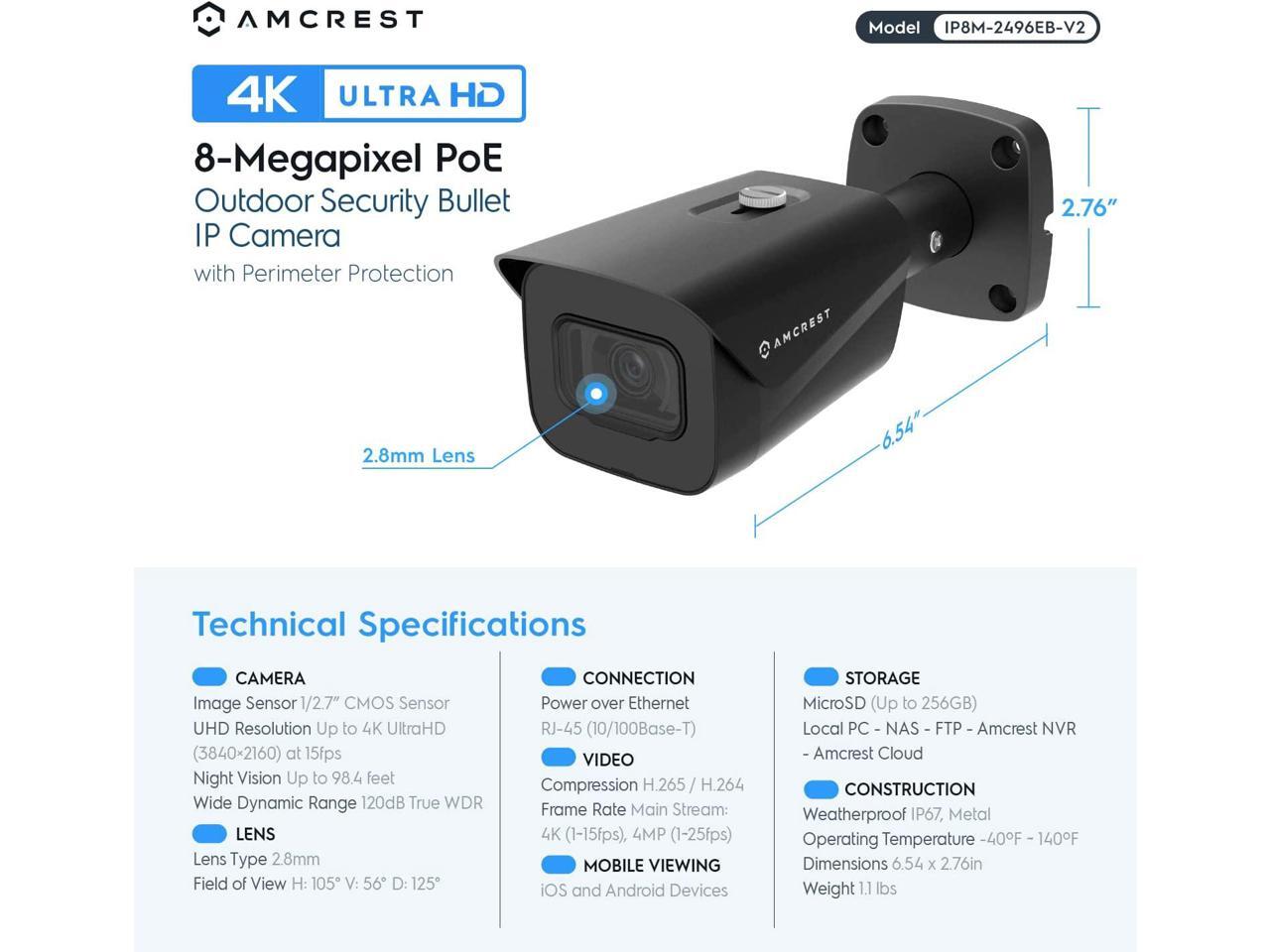 Amcrest UltraHD 4K (8MP) Outdoor Bullet Security IP POE Camera, 98ft NightVision, 2.8mm Lens, IP67 Weatherproof, 256GB MicroSD Recording, Black (IP8M-2496EB-V2)
