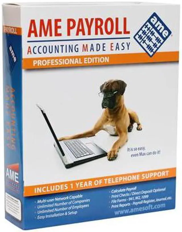 | System Requirements | Computer with 1GHz or higher processor, 256 MB RAM, 100 MB of disk space, CD/DVD Rom and Display with 800x600 or higher resolution Windows operating system (98, 98SE, XP, Vista, 2000, 2003). XP or Vista preferred Laser or Inkjet printer Options & Accessories: AME Accounting Suite AME General Ledger AME Accounts Payable AME Accounts Receivable AME Add-on modules - PDF Converter, E-filing, MICR check printing, Direct Deposit AME Payroll (Small Business Edition) |