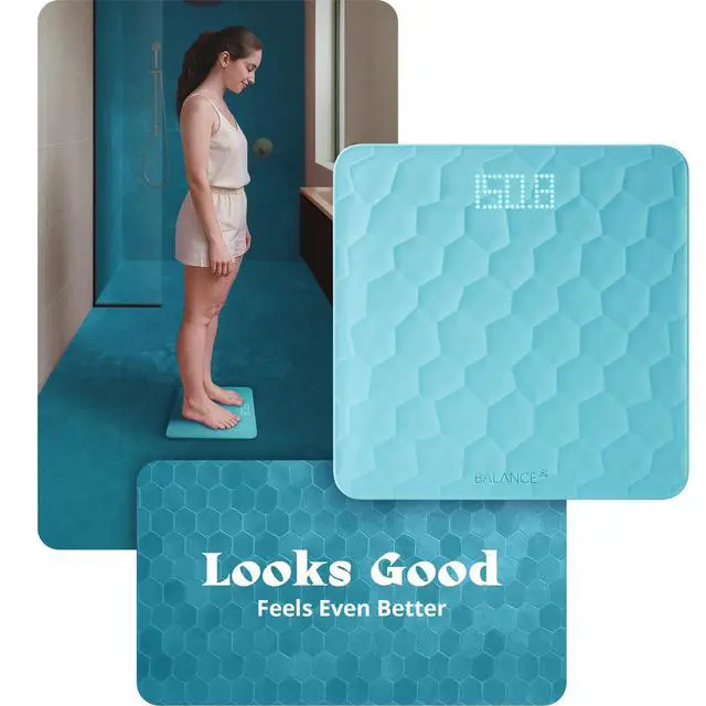 Slim, stylish, and easy to tuck away, our silicone bathroom scale auto-calibrates, so it's always ready for the next use!