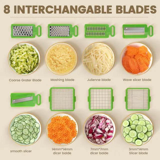 Sharp & Durable Stainless Steel Blades - Precision Cutting Every Time: Crafted with food-grade stainless steel blades, this onion chopper delivers ultra-sharp, rust-resistant performance. The 8 specialized blades (including 3 chopper sizes and 5 interchangeable blades for slicing/julienning/grating) ensure uniform cuts without crushing ingredientssave time chopping an entire cabbage for coleslaw or mincing garlic for stir-fries. Built to last, its more reliable than flimsy plastic cutters.
