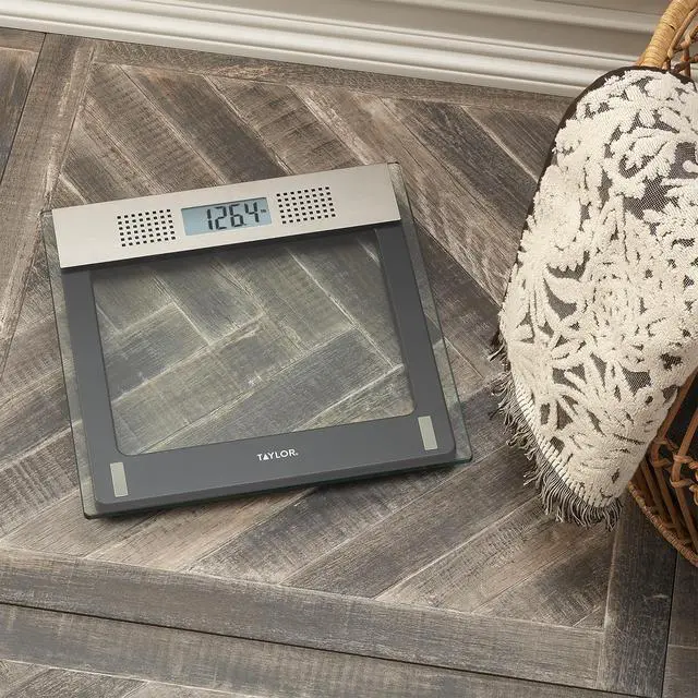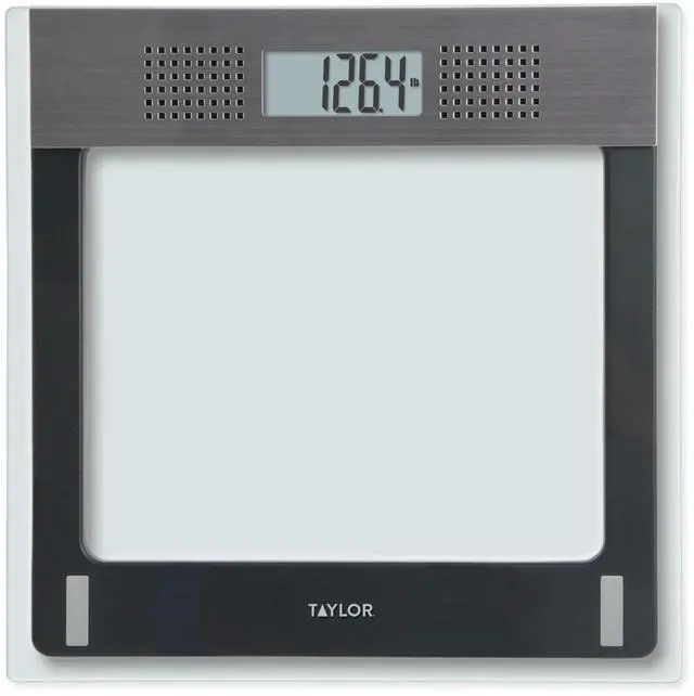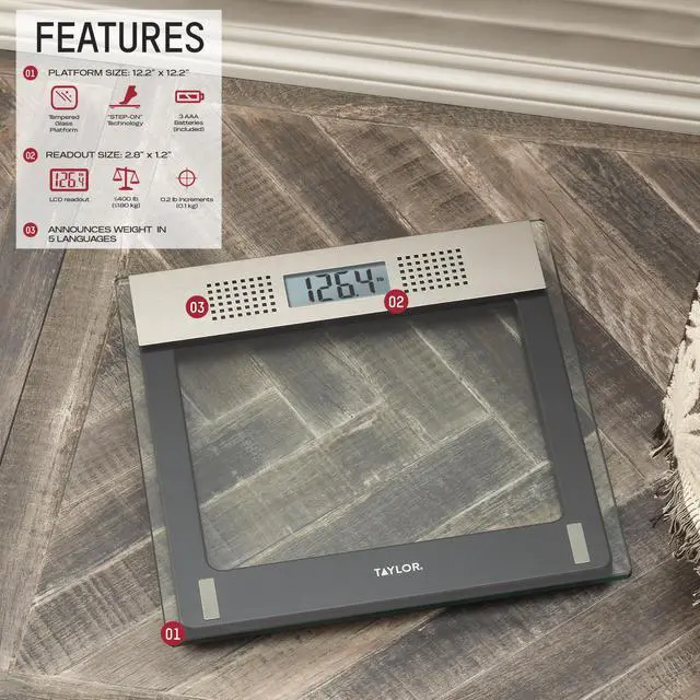 Reach weight goals and measure progress with the functional and stylish Taylor Electronic Glass Talking Scale. Read weight at a glance with the digital talking scale's 1.1-inch LCD display or listen to it announced in a female voice. Ideal for vision-impaired users, listen to weights announced in pounds in English or in kilograms in Spanish, Greek, German, or Croatian. Built to accommodate up to approximately 440 pounds (200 kilograms), the tempered glass scale platform features stainless steel accents for a clean, sleek look. Comfortably measure weight with a spacious 12.2-inch square platform. Plus, you'll never have to worry about excessive battery drain with a number of electronic scale features including instant on, auto off, and a low battery indicator. 3 AAA batteries are included.