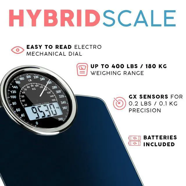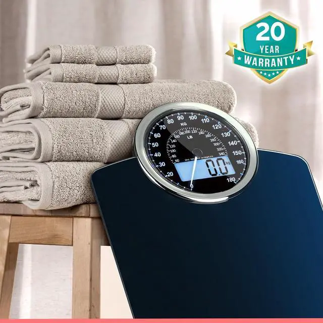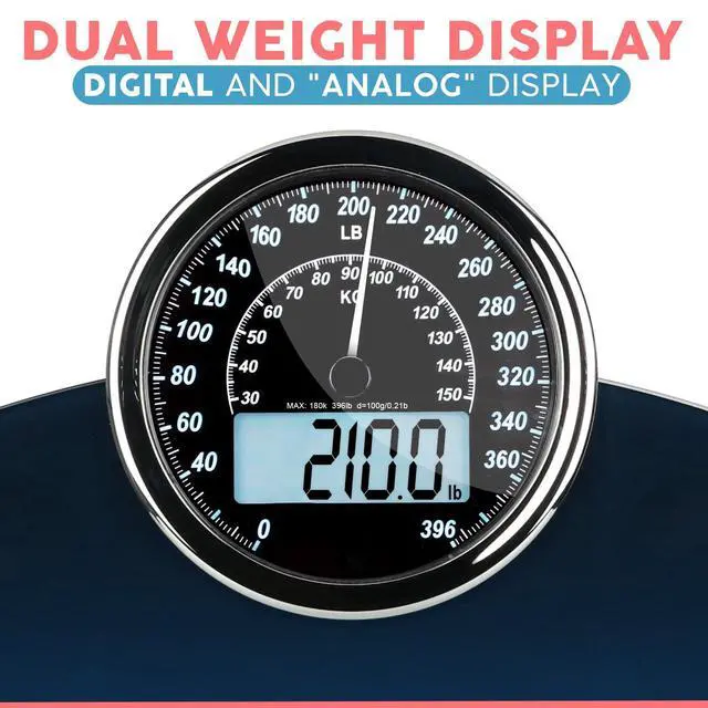 Hybrid 2-in-1 Analog & Digital Weighing Scale for Body Weight up to 400lbs - Thick Tempered Glass - Extra Large Display - Easy to Read Digital Bathroom Scale - Blue with Black Backlight