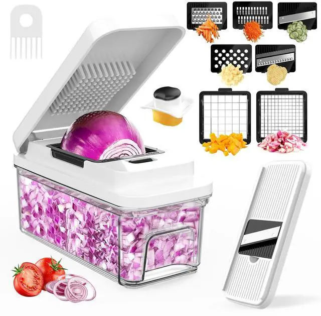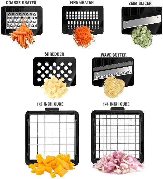 The veggie slicer comes with a spiralizer insert, configured with 6 different blades can be used for slicing, mincing, chopping and shredding.