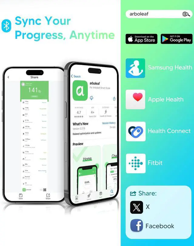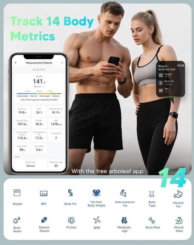 With Bluetooth connectivity, the scale syncs seamlessly with the free arboleaf app, allowing you to track 14 key body metrics, including muscle mass, body water, and metabolic age. Whether you're managing fitness goals or simply staying informed, this smart scale helps you stay on track with clear insights and easy-to-understand trends.