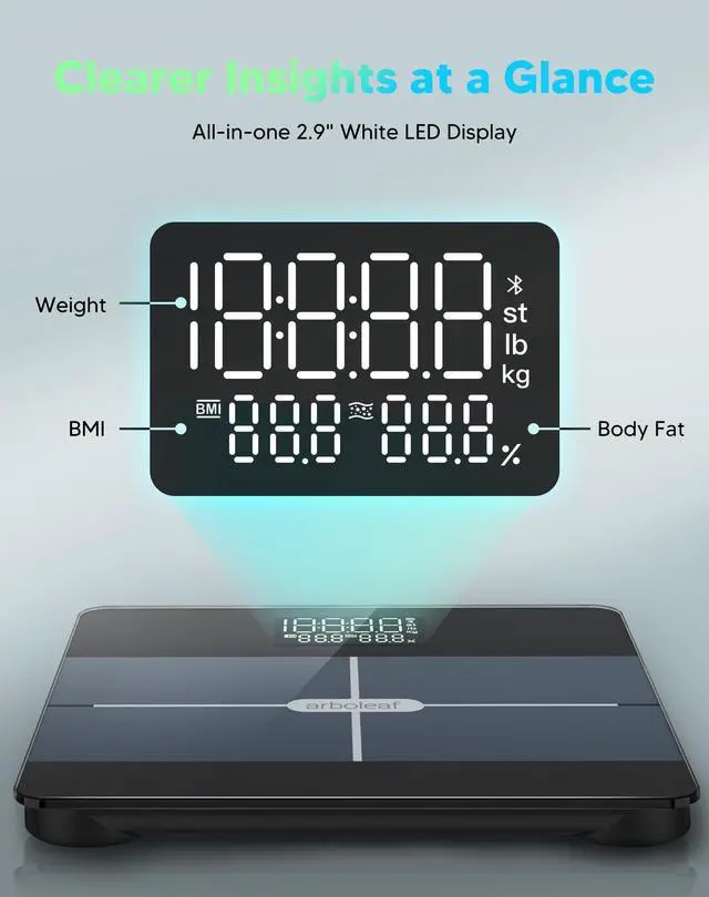 Take control of your wellness journey with the arboleaf Smart Body Fat Scale. Designed for accuracy and ease of use, this digital scale features a sleek, tempered glass platform and a bright 3-in-1 LED display that shows your weight, BMI, and body fat percentage at a glance. No account or login is required to get startedjust step on and get your results instantly.