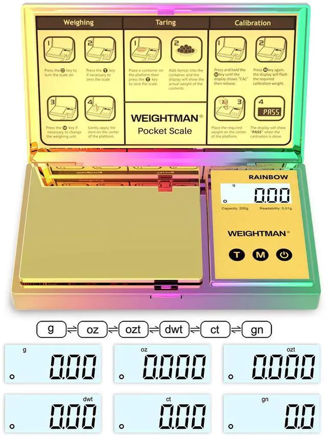 HIGH PRECISION: The high-precision load cell is carefully selected to ensure its accuracy is ±0.03g, its graduation is 0.01g. Maximum capacity is 200g. Units of measurement include Gram (g), Grain (gn), Ounce (oz), Troy Ounce (ozt), Pennyweight (dwt), and Carat (ct)